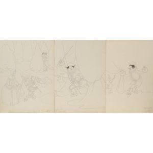 André Sauret, 1955. Ens. de 3 dessins à l'encre de chine, non signés, 32x24 cm. Œuvre intégral : pour sc. XIV, p. 193, 7603 - pour sc. XXI, p. 205, 7605 - pour sc. VI, p. 177, 7606.
