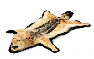 spécimen monté en tapis avec doublure en feutrine, travail réalisé en Afrique du Sud, quelques accidents, en l'état Canis mesomelas