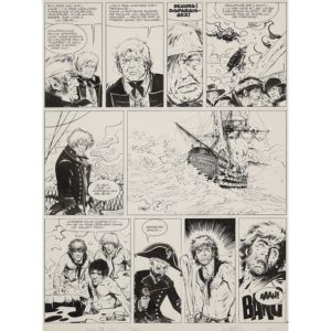 VANCE William (Van Cutsen William) (1935 - 2018) "Bruce J.Hawker" - "Press gang" " Bruce J. Hawker : Press gang ". Planche originale N°30 du troisième tome de cette série maritime parue en 1987 aux Editions Le Lombard. Encre de chine sur papier. Signée et datée en case 6. Format 45 x 34 cm. TRES BON ETAT.