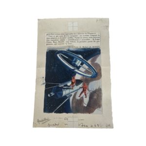 PASCAL Claude (1931-1993) " Station orbital ". Illustration originale en couleurs directes et texte collé, pour imager l'article de Michel Le Roisin sur le thème de la mise en place plus ou moins prochaine des voyages commerciaux inter-sidéraux et l'apparition des hôtesses de l'espace. Technique : gouache et encre de couleurs sur papier épais. (TRÈS BON ÉTAT. Trace de pli en son milieu et papier un peu sali par le temps, sans incidence pour un encadrement.)