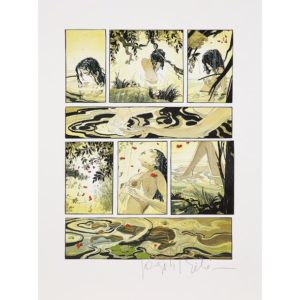 BÉHÉ (Joseph GRIESMAR) (Né en 1962) " Chimères : T1 Apphrodite ". Très belle planche de mise en couleurs, cases découpées-collées, d'" Aphrodite ", premier tome de la série " Chimères " scénarisée par T. Mosdi et parue en 2003 chez l'éditeur Vent d'Ouest. Technique : aquarelle et encres de couleurs sur papier de format 29,7 x 39,5 cm. Signature en bas. (ÉTAT NEUF, conservation parfaite.)