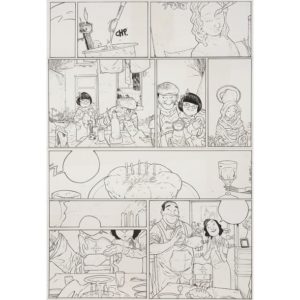 LAFEBRE Jordi (Né en 1979) " Lydie ". Planche originale de l'album, scénarisé par Zidrou, publié en 2010 aux éditions Dargaud. Magnifique découpage et encrage, belle finesse de traits pour les cases 4, 5 et 10. L'auteur a travaillé chacune des cases isolément et a reconstitué ensuite sa planche par papier adhésif (au verso). Technique : esquisse à la mine de plomb et encre de Chine sur papier, format de 35 x 50,5 cm. Signature au milieu à droite. (ÉTAT NEUF, conservation parfaite.)