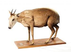 très belle taxidermie ancienne d'une espèce en voie de régression ; ce spécimen comprend un trophée recordable repris au Rowland Ward et au Safari Club International. A ce titre, les 2 plaques métalliques de ces 2 organismes sont insérées sur le socle en bois Cephalophus silvicultor