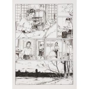 FAURE Michel (Né en 1947) " Le Maître de peinture : T2 L'Inexplicable don ". Planche originale 21 du second tome de cette série publiée par les éditions Glénat. Beau découpage pour cette planche comportant 5 " rustines " et quelques corrections par Blanco. Technique : esquisse à la mine de plomb, encre de Chine et gouache blanche. Papier blanc de 250 à 300 g de format 32,5 x 43 cm. (ÉTAT NEUF, conservation parfaite.)