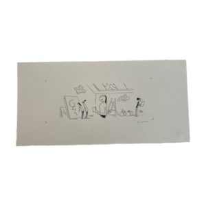 PETIT-ROULET Philippe (Né en 1953) " Atelier ". Dessin original paru dans " L'Express dix ", supplément du magazine éponyme. Le trait de l'auteur d'une très grande lisibilité est fort prisé dans la presse et la communication. Réalisation sur papier Art Schœller de format 24 x 50 cm. Technique : encre de Chine. Signature en bas à droite. (ÉTAT NEUF, conservation parfaite.)