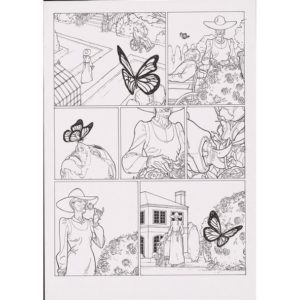PINHEIRO Nicolaï (Né en 1985) " Un Avion sans elle ". Planche originale, page 52 de l'édition normale Glénat. Il s'agit ici d'une planche originale sur papier recréée par l'auteur, puisqu'à la base l'album est numérique. L'encrage est très finement exécuté et le papillon parcourt les cases avec un bel effet de relief. Technique : planche manuelle à l'encre de Chine sur papier de fort grammage au format 29,5 x 42 cm. Signature en bas de page, titre et date au dos. (ÉTAT NEUF.)