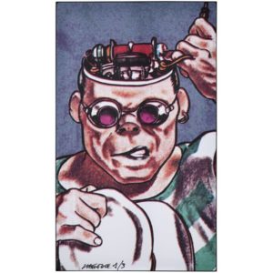 LIBERATORE Gaetano (Né en 1953) " Ranxerox - Branchement ". Dessin extrait du premier tome des aventures de Ranxerox " Ranxerox à New York ", diffusé en 1981, création du scénariste S. Tamburini et du dessinateur G. Liberatore. Impression numérique en sublimation (1400 dpi) sur toile, permettant de respecter au plus près le dessin et les couleurs du dessin original. Toile tendue sur cadre en aluminium, finition anodisée, au format 60 x 100 cm. Tirage en 3 exemplaires signés et numérotés en bas à gauche, ici numéro 1. Art Boulevard éditions 2017. (ÉTAT NEUF.)