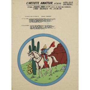 HERGÉ Studios Affiche " L'Artiste amateur - Tintin en Amérique ". Affiche impression sérigraphiée de format 30 x 41 cm. Avec instructions français & néerlandais. Planche à coller sur support bois adapté afin de fabriquer soi-même divers présentoirs. Etablissements Jacques OBRA, liège Belgique 1954. TRES BON ETAT. Papier légèrement jauni avec traces de manipulation. © Hergé/Moulinsart - 2021.