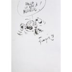 FRANQUIN André (1924-1997) Les Aventures de Spirou et Fantasio. " Le Gorille a bonne mine ". Éditions Dupuis en couleurs. Album cartonné dos carré bleu de 1977. En page de préface, une dédicace nominative et datée de 1979 d'André Franquin, dessin représentant le Marsupilami, exécuté au feutre noir. (BON ÉTAT. Dédicace impeccable. Dos complet avec coiffes tassées, perte de couleurs et amorces de déchirures. Premier et quatrième plats avec plusieurs rayures, petits chocs et marquages d'écriture par transparence. En page de garde, plusieurs chiffres annotés à la mine de plomb. Le cahier est bien solidaire et sans défaut autre que quelques traces minimes de lecture.)