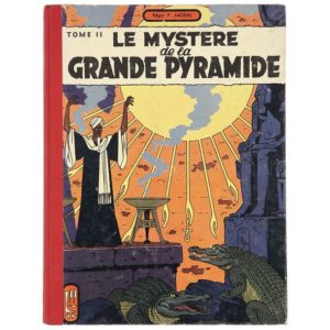 Edgar Pierre JACOBS (1904-1987) Les Aventures de Blake et Mortimer. " Le Mystère de la grande pyramide T2 La Chambre d'Horus " - Éditions du Lombard - Couleurs. Album cartonné dos toilé rouge. Première édition 1955. 4ème plat peau d'ours, imprimerie Van Cortenbergh et dernier titre " Le Puit 32 ". Présence du point Tintin, intact. (BON ÉTAT. Avec point Tintin. 1er plat avec frottements sur le contour, plus accentués sur arête basse, frottements et petites pertes de couleurs, coins émoussés/râpés. 4ème plat avec frottements sur arêtes basse et haute avec pertes de couleurs et petit manque, manques en haut, coins émoussés, écriture coin haut. Dos toilé complet avec coiffes tassées, sans manque de couleurs. Pages de garde quasi parfaites. Cahier bien solidaire. Les 10 premières pages avec taches. Ensuite, de la page 23 à la page de postface, plis s'accentuant progressivement.)