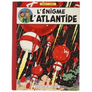 Edgar Pierre JACOBS (1904-1987) Les Aventures de Blake et Mortimer. " L'Énigme de l'Atlantide " - Éditions du Lombard - Couleurs. Album cartonné dos toilé rouge. Première édition française et belge 1957. 4ème plat peau à damier vert, imprimerie Ch. Bulens et dernier titre " Cà ! C'est du sport ". Présence du point Tintin, intact. (TRÈS BON ÉTAT. Avec point Tintin. 1er et 4ème plats avec frottements et petites pertes de couleurs, petites plissures du pelliculage. Coins hauts émoussés, en bas émoussés râpés. Frottements sur l'arête basse avec perte de couleurs. Très beau et complet dos toilé, coiffe haute superbe et la basse légèrement tassée sans perte de couleurs. Pages de garde avant avec petit manque en haut droit. Les pages de garde comportent un défaut de collage et sont froissées. En haut droit page titre, tentative d'effacement d'un ancien tampon du propriétaire. Cahier bien solidaire et propre, excepté pour les pages 17 à 24 tachées en milieu bas.)