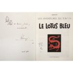 HERGÉ (Georges RÉMI) (1907-1983) Les Aventures de Tintin. " Le Lotus bleu " - Éditions Casterman - Couleurs. Album cartonné à dos pincé carré, 4ème plat C3 Ter de 1979. En page de préface, un superbe dessin dédicace de l'auteur et la signature de Tchang. Sur la page de postface, une carte postale maintenue par quatre coins photo. (TRÈS BON ÉTAT. Rayures visibles sur les deux plats et petit défaut en coiffe haute. Intérieur parfait.) © Hergé/Moulinsart - 2021.