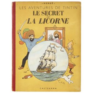 HERGÉ (Georges RÉMI) (1907-1983) Les Aventures de Tintin. " Le Secret de la Licorne " - Éditions Casterman - Couleurs. Album cartonné dos rouge. 4ème plat B1 de 1947. (TRÈS BON ÉTAT. Dos complet avec coiffes basses et hautes et coins émoussés. Pages de garde superbes et cahier bien solidaire. Couleurs vives.) © Hergé/Moulinsart - 2021.