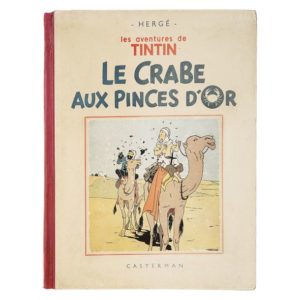 HERGÉ (Georges RÉMI) (1907-1983) Les Aventures de Tintin. " Le Crabe aux pinces d'or " - Éditions Casterman - Noir et Blanc. Album cartonné dos rouge Pellior. Premier plat image collée et 4ème plat A13 de 1941. En page de titre les pinces du crabe sont vers le haut. Inversion des strips en page 77. Avec pages de garde blanches et ses 4 superbes hors-textes aux couleurs vives et toniques. (TRÈS BON ÉTAT. Dos complet, restauration sur le haut et fendu sur bas du 4ème plat sur 9 cm, cahier bien solidaire avec papier très légèrement jauni. Coiffes basses et hautes et coins émoussés.) © Hergé/Moulinsart - 2021.