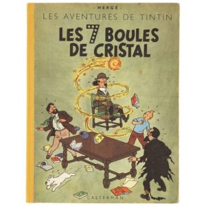 HERGÉ (Georges RÉMI) (1907-1983) Les Aventures de Tintin. " Les 7 boules de cristal " - Éditions Casterman - Couleurs. Album cartonné dos jaune et page de titre, titre en noir. 4ème plat B2 de 1948. (BON ÉTAT. Plats très propres mais au 4ème plat le bas gauche est plissé. Cahier bien solidaire et très propre. Coins légèrement arrondis et léger fendillement sur ceux du bas. Dos complet et très beau mais entièrement reconstitué avec un toilage récent.) © Hergé/Moulinsart - 2021.