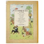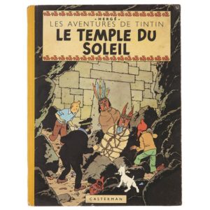 HERGÉ (Georges RÉMI) (1907-1983) Les Aventures de Tintin. " Le Temple du Soleil " - Éditions Casterman - Couleurs. Album cartonné dos jaune et pages de garde bleu foncé. Version avec 2 symboles Inca en page titre. 4ème plat B3 de 1949. Première édition. (TRÈS BON ÉTAT. 1er plat couleurs vives avec petit choc en milieu bas, restauration des 2 coins, contour légèrement frotté. 4ème plat avec coins émoussés, tâché au-dessus de la tête de Haddock. Dos complet avec petits manques couleurs et coiffes haute et basse plissées, non restaurées. Pages de garde impeccables. Cahier bien solidaire, une dizaine de pages avec taches de lecture en partie basse.) © Hergé/Moulinsart - 2021.