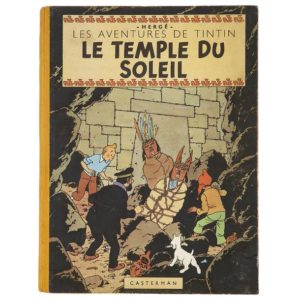 HERGÉ (Georges RÉMI) (1907-1983) Les Aventures de Tintin. " Le Temple du Soleil " - Éditions Casterman - Couleurs. Album cartonné dos jaune et pages de garde bleu foncé. Version avec 2 symboles Inca en page titre. 4ème plat B3 de 1949. Première édition. (TRÈS BON ÉTAT. 1er et 4ème plats superbes aux couleurs vives avec frottements en bord bas et coins émoussés. Dos complet avec coiffes haute et basse plissées avec perte de couleurs. Pages de garde impeccables. Cahier propre et bien solidaire, 4 pages avec petite déchirure sans manque, trace de pliure en bas droit des pages 39, 41 et 43.) © Hergé/Moulinsart - 2021.