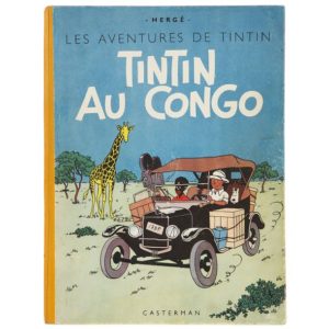 HERGÉ (GEORGES RÉMI) (1907-1983) Les Aventures de Tintin. " Tintin au Congo ". Éditions Casterman avec pages de garde bleu foncé. Album cartonné, édition originale en couleurs avec dos jaune et 4ème plat B1 pour 1945/46 et 1947, pull d'Haddock en deux couleurs. Titre de couverture en blanc et celui de première page en bleu. (TRÈS BON ÉTAT. Dos quasi complet, retouche couleurs en son milieu pour combler un manque. Coiffes hautes et basses émoussées/élimées. Premier et quatrième plats avec frottements et légères pertes de couleurs + frottements sur les contours. Deux rayures importantes au 4ème plat mais peu profondes, sans déchirure. Les coins sont émoussés et plissés pour ceux du 4ème plat. Très belles pages de garde mais mention d'un nom et adresse en haut de la première. Cahier solidaire et pages superbes, sans manque, déchirure ou retouche. Telles à l'habitude, elles ont jauni, de manière quasi uniforme.) © Hergé/Moulinsart - 2021.