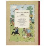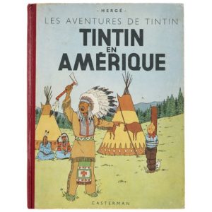 HERGÉ (GEORGES RÉMI) (1907-1983) Les Aventures de Tintin. " Tintin en Amérique ". Éditions Casterman en couleurs avec pages de garde bleu foncé. Album cartonné dos rouge avec 4ème plat B1 pour 1945/46 et 1947, pull d'Haddock en deux couleurs. Titre en rouge en première page. (TRÈS BON ÉTAT. Dos complet avec coiffes hautes et basses légèrement émoussées/élimées, sans retouche. Premier et quatrième plats avec frottements et légères pertes de couleurs + frottements sur les contours. Les coins sont émoussés. Tassement et fendillement léger en coins hauts du 4ème plat, le coin bas est émoussé. Très belles pages de garde, bien propres. Le cahier est solidaire et les pages sont quasi parfaites, magnifiques.) © Hergé/Moulinsart - 2021.