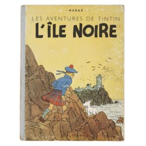 HERGÉ (Georges RÉMI) (1907-1983) Les Aventures de Tintin. " L'Ile noire " - Éditions Casterman - Couleurs. Album cartonné dos bleu. Album sans retouche ni restauration. 4ème plat A23 Bis blanc de 1944. Curieuse particularité sur cette édition, en page 47, les couleurs changent. Le kilt de Tintin devient vert et son pull rose. (TRÈS BON ÉTAT. 1er et 4ème plats avec frottements et coins émoussés arrondis. 4ème plat fendu sur 2 cm en haut droit près du dos. Le dos est sans retouche et partiellement décoloré, les coiffes sont tassées et fendues sur 1 cm. Pages de garde en très bel état. Cahier bien solidaire, papier jauni et 12 pages avec taches importantes.) © Hergé/Moulinsart - 2021.
