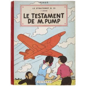 HERGÉ (Georges RÉMI) (1907-1983) Les Aventures de Jo, Zette et Jocko. " Le Stratonef H 22 : Le Testament de M. Pump " - Éditions Casterman - Couleurs. Album cartonné dos rouge. Non restauré. 4ème plat B5 de 1951. Première édition. (TRÈS BON ÉTAT. 1er et 4ème plats aux belles couleurs, frottements légers sur les contours avec pertes de couleurs, coins émoussés plissés. Couleur jaune du 4ème plat plus pâle sur la partie droite. Dos complet, coiffes émoussées et perte de couleurs. Pages de garde splendides. Cahier bien solidaire et très propre. © Hergé/Moulinsart - 2021.