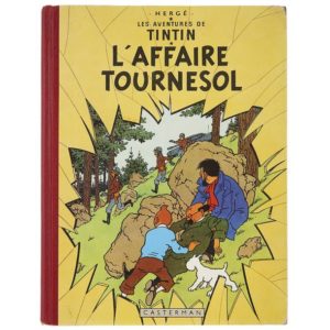 HERGÉ (Georges RÉMI) (1907-1983) Les Aventures de Tintin. " L'Affaire Tournesol " - Éditions Casterman - Couleurs. Album cartonné dos rouge et pages de garde bleu foncé. 4ème plat B19 de 1956. Mention dernière page Imprimerie Danel et N°1213 pour première édition française. (BON ÉTAT. 1er plat légèrement plissé vers haut gauche. Coin haut droit avec pli marqué et coin bas émoussé. Rayures sur la partie centrale du dessin. Au 4ème plat, coin haut plissé et coin bas émoussé. Pages de garde très belles, petites taches sur les dernières. Dos complet avec coiffes émoussées et retouche couleurs. Cahier solidaire mais distendu. Un tiers des pages avec taches de lecture, 4 pages avec déchirure sans manque, page 53 avec écriture en milieu bas.) © Hergé/Moulinsart - 2021.