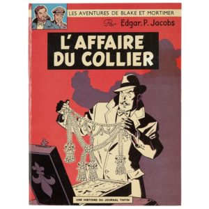 JACOBS Edgar Pierre (1904-1987) Les Aventures de Blake et Mortimer. " L'Affaire du collier ". Éditions du Lombard en couleurs. Album cartonné à dos pelliculé carré pincé de 1967. Imprimerie Leempoel et mention " D.1967 ". Particularité : le cartouche " Une histoire du journal Tintin " est sur fond blanc et non sur l'habituel fond jaune. (TRÈS BON ÉTAT. Dos complet avec marques d'écrasement, une perforation en partie basse au 4ème plat et coiffes hautes et basses légèrement émoussées tassées avec retouches couleurs. Premier et quatrième plats superbes, petites marques en tiers haut gauche du 4ème. Coins hauts piquants et bas avec petite retouche couleur. Pages de garde impeccables, cahier et pages très propres presque parfaites.)
