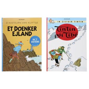 HERGÉ (Georges RÉMI) (1907-1983) Les Aventures de Tintin - Éditions étrangères ou langues régionales. Lot de deux albums en version cartonnée. " Tintin péi Tibé / Tintin au Tibet ". Éditions Epsilon BD! en Créole Réunionnais. " Et Doenker Ejland / L'Ile noire ". Éditions Casterman en Flamand Ostendais. Tirage à 3100 exemplaires. (ÉTAT COMME NEUF. Chacun très légèrement marqué sur le haut du 4ème plat.) © Hergé/Moulinsart - 2021.