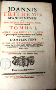 [TRITHEMIUS (Joannes)]. — Annalivm hirsavgiensivm [...]. — [Saint-Gall,] Typis ejusdem Monasterii S. Galli, Excudebat Joannes Georgius Schlegel, 1690. — 2 tomes en un volume petit in-folio, vélin ivoire à petits recouvrements (reliure de...