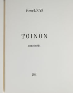 [LOUŸS (Pierre) - CURIOSA]. — Toinon, conte inédit. — S. l., 1991. — In-4° en feuilles, sous couverture.