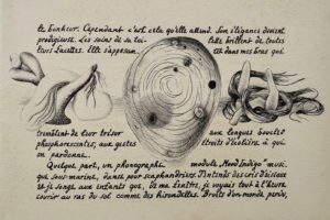 Paris, Jeanne Bucher, 1942. In-8 à l’italienne, en feuilles, couverture illustrée rempliée comportant un découpage original titré par Georges Hugnet qui est différent sur chaque exemplaire. Édition originale dont le texte de Georges Hugnet et les illustrations de Christine Boumeester et Henri Goetz sont entièrement lithographiés.