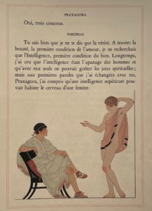 Paris, Les Centraux Bibliophiles, 1932. In-4, en feuilles, chemise et étui de l'éditeur. Adaptation de l'Assemblée des Femmes d'Aristophane, illustrée de 64 compositions in-texte de Kuhn-Regnier gravées sur bois, en couleurs, par Pierre Bouchet.
