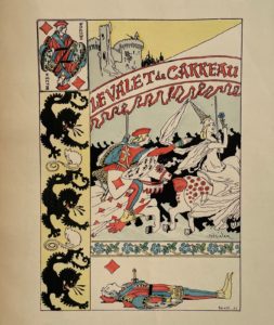 AURIOL (Georges). Les Rondes du Valet de carreau. Paris, Marpion et Flammarion, 1887. In-4, broché, couverture rempliée illustrée de l'éditeur. Édition originale de ce recueil de onze poésies de Georges Auriol mises en musique par Marcel Legay et illustrées par Steinlen d'une composition pour la couverture tirée en couleurs sur papier bleu, et de 10 illustrations hors texte en couleurs. La préface en vers est due à François Coppée. Crauzat n° 544.