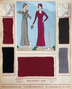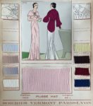 In-4, 43 planches, couverture cartonnée munie d'une attache et ornée d'une feuille de soie illustrée d'un motif floral. Bel ensemble d'échantillons de soie Vermont lesquels sont répartis par couleurs sur des planches illustrés de modèles féminins. On retrouve du satin fleuri, du saurien velouré, de la crêpe de soie façonnée, de la galuchette dégradée, ou encore du velours de Lyon.