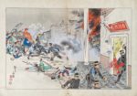 Petit album accordéon d'estampes. Encre et polychromie sur papier, format ôbon représentant des scènes de la guerre sino-japonaise.