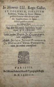 DORAT (Jean) et Jean-Antoine de BAÏF — In Henrici III Regis Galliæ, et Poloniæ, fœlicem reditum, versus, in fronte Domus, publicæ Lutetiæ urbis ascripti, quo die supplicationes & Ignes sole[m]nes publico conventu celebrati sunt.