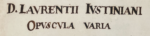 Cette importante édition des œuvres de Laurent Justinien (1380-1456), évêque de Castello et premier patriarche de Venise, se compose de dix-neuf traités sous pagination séparée, mais elle ne se trouve que très rarement complète. Notre exemplaire réunit quatre de ces traités, coiffés d'un titre général manuscrit.