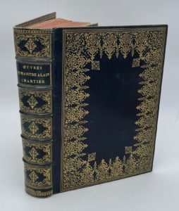Paris, Pierre Le Mur, 1617. In-4, maroquin bleu nuit, large dentelle de filets et fleurons dorés, dos orné, dentelle intérieure, tranches jaspées (Levasseur jeune).Dernière édition ancienne des œuvres d'Alain Chartier, mise au jour par André Du Chesne (1584-1640), historien et érudit originaire du Chinonais.