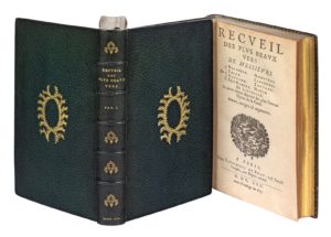 Paris, Toussaint du Bray, 1630. 2 volumes in-8, maroquin vert, médaillon de lauriers doré au centre, dos orné, dentelle intérieure, tranches dorées (Reliure du XIXe siècle).Édition la plus complète de ce célèbre recueil poétique collectif, connu sous le nom de « recueil malherbien » parce que l'esthétique de François de Malherbe, mort deux ans plus tôt, et de son école y est prédominante.