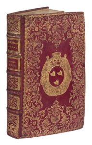 Paris, veuve d'Houry, 1732. In-8, maroquin rouge, importante dentelle rocaille à la plaque dorée, armoiries au centre, dos orné de fleurs de lis, dentelle intérieure, doublure et gardes de papier d'Augsbourg, tranches dorées (Reliure de l'époque).Belle reliure en maroquin rouge ornée d'une plaque à la Dubuisson aux armes de Miromesnil (1723-1796), garde des sceaux de Louis XVI entre 1774 et 1787.