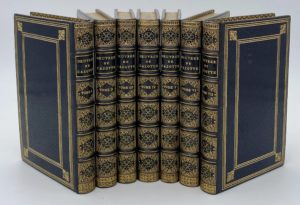 1788. 7 volumes in-18, maroquin bleu nuit, décor à la Du Seuil, dos orné aux petits fers, dentelle intérieure, tranches dorées sur marbrure (Allô).Charmante édition ornée de 7 frontispices par Balthasar-Antoine Dunker.