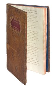 En l'année 1780. In-4 de [28] ff., veau marbré, triple filet doré et fleurons d'angles, grande pièce de titre de maroquin rouge sur le premier plat, dos muet orné, roulette sur les coupes, tranches rouges (Reliure de l'époque).Élégant manuscrit du xviiie siècle consacré à la famille de Fransures.