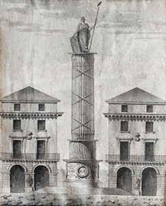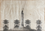 Quatre dessins dans deux cadres : Statues révolutionnaires et deux bâtiments (1, 2) ; et Colonnes révolutionnaires entre deux bâtiments (3, 4). Pierre noire (1), plume et encre noire, lavis gris (2,3,4).