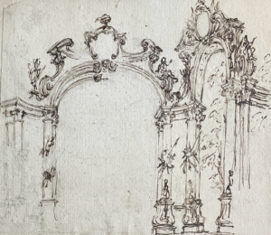 Deux arches ornementées. Pierre noire, plume et encre brune.