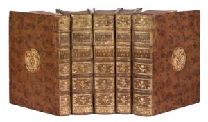 Paris, Imprimerie royale, 1759-1762. 5 volumes in-4, veau marbré, armoiries au centre, dos orné, tranches rouges (Reliure de l'époque).Célèbre périodique annuel réunissant l'ensemble des mémoires et communications scientifiques des membres de l’Académie des sciences.