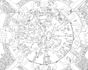 Il renferme 2 tableaux hors texte et 4 planches lithographiées repliées en fin de volume, parmi lesquelles se trouvent deux reproductions de grandes dimensions (env. 53 x 58 cm) du Zodiaque de Dendérah, lithographiées par Roux d'après Gau.