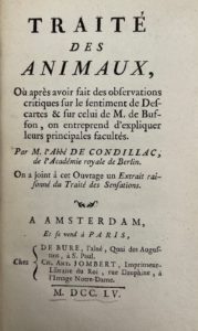 CONDILLAC (Étienne Bonnot de) — Traité des animaux, où après avoir fait des observations critiques sur le sentiment de Descartes et sur celui de M. de Buffon, on entreprend d'expliquer leurs principales facultés.