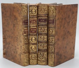 Ensemble trois ouvrages en reliure similaire provenant de la bibliothèque Pauline Pougeol (1728-1813), l'épouse de Jean Dervieu du Villars, président à la Cour des monnaies de Lyon, avec ex-libris.