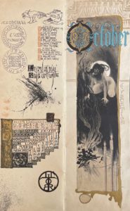 Paris, Lemercier, l'Art Nouveau, 1896. In-folio étroit (50.5 x 15 cm), broché, couverture noire, emboîtage postérieur. Édition abondamment illustrée et composée ainsi : titre, justification, frontispice, phases de la lune, poème de la sorcière, les 24 pages correspondant aux 12 mois du calendrier avec texte illustré et grande lithographie en regard, 2 pages de table des planètes, texte d'Austin de Croze.
