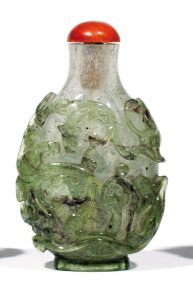 Flacon tabatière en verre overlay vert sur fond translucide finement sculpté de dragons. Bouchon en corail.